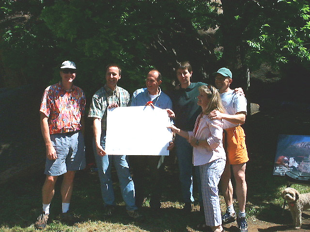 Eric Hobday (Access Fund Board member and Secretary), Shawn Tierney (Access Fund Access and Acquisitions Director), Marion Hutchison (WMCC Board member), Tony Mayse (WMCC Board member) and Lori Boren (WMCC member) present the ceremonial deed to Baldy Point to John Ressmeyer (Director of Oklahoma State Parks) at the Baldy Point Preservation Ceremony on May 5, 2001. |