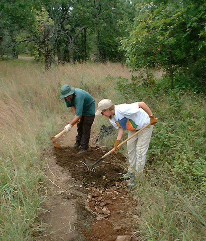 Terry Messer and Annie Wilson spreading fill material to cover an erosion trench just past Boulder Cabin.