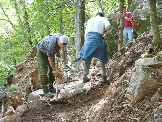 (Left to Right) Samuel Bradley and Peter Chorlton smooth the trail as Marion Hutchison photographs the finished product.