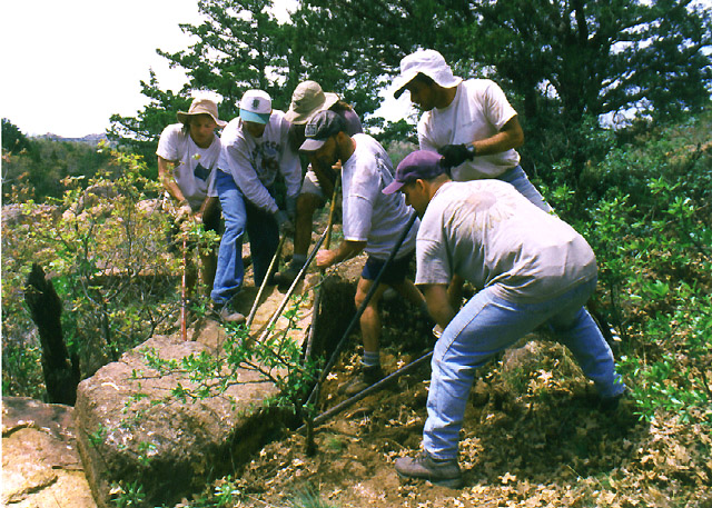 Volunteers use pry bars to move a large boulder. Photo by Jim Angell